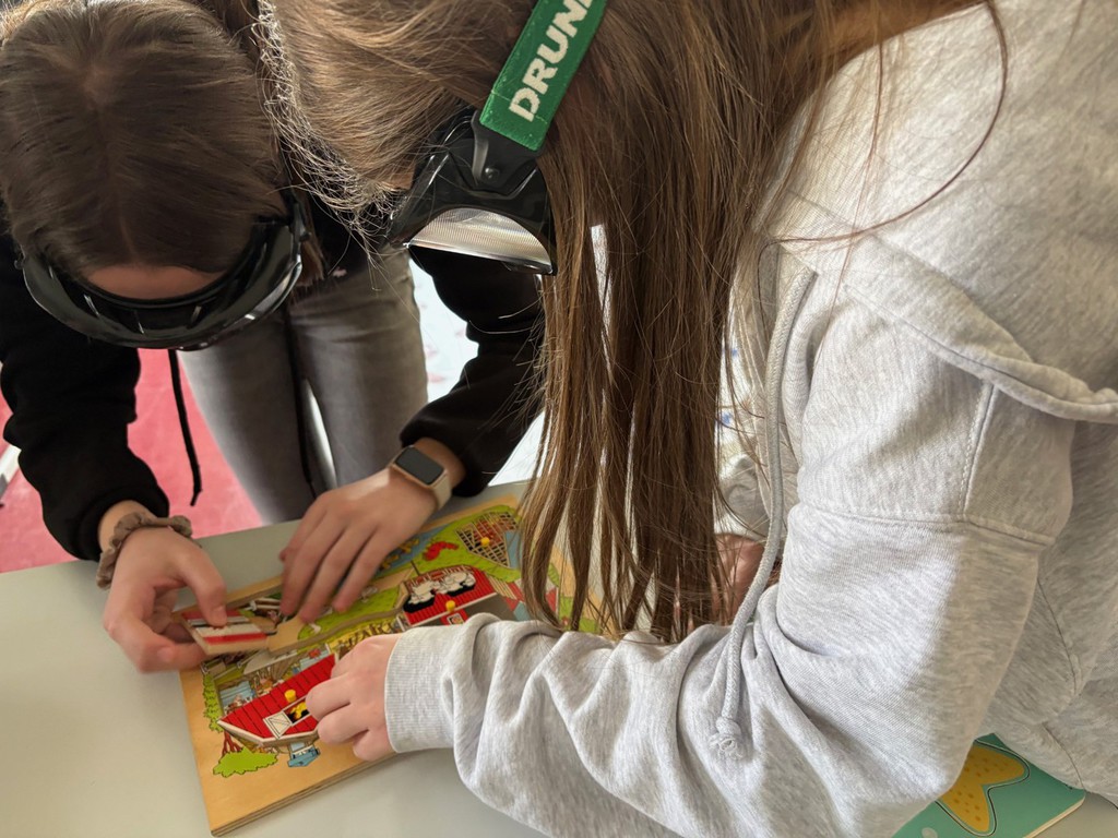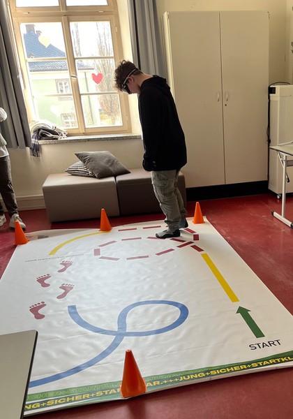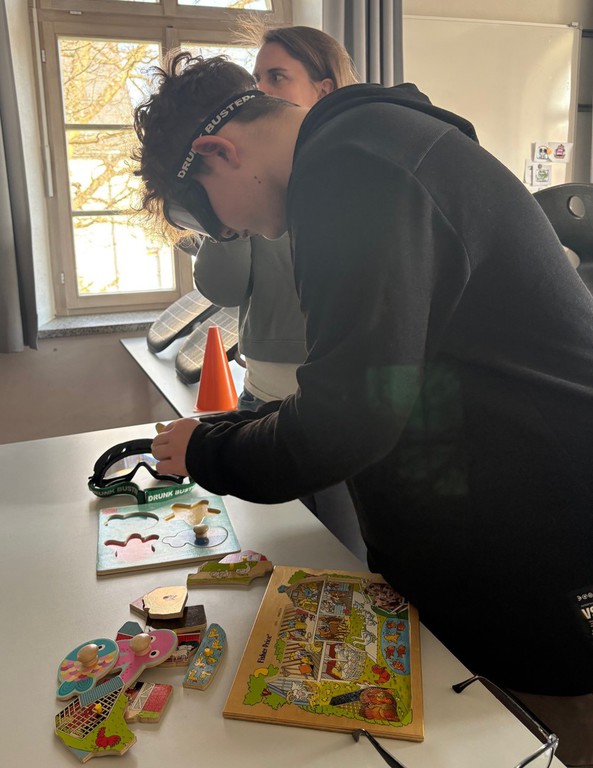 An fünf Station des Parcours verbringen die Schülerinnen und Schüler jeweils 15 Minuten. Beispiel: „Drunk-Buster“ – Voll daneben. Beim Aufsetzen der Rauschbrille erlebten die Jugendlichen, wie schwierig es wird, einen Hindernis-Parcours zu meistern oder Puzzleteile richtig zu legen.