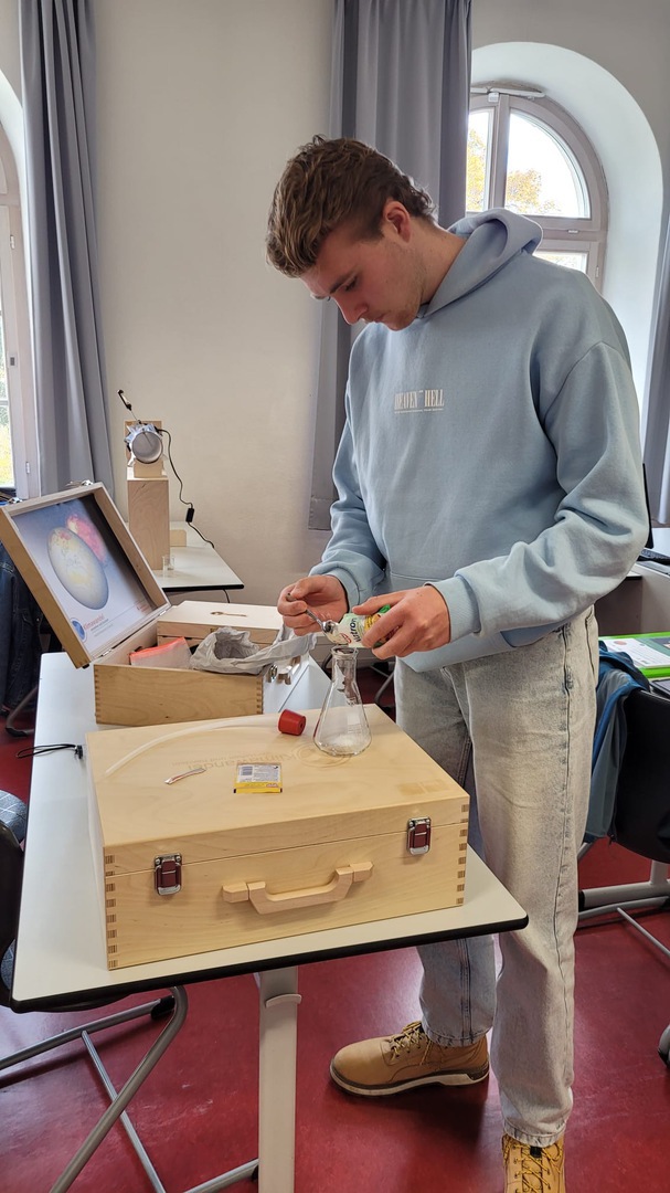 Unter Anleitung von StR Jonas Browa arbeiteten die Schülerinnen und Schüler mit dem Klimakoffer und machten Versuche zur Erderwärmung. Es wurde zum Beispiel untersucht, welchen Einfluss CO2 auf die Erderwärmung hat.