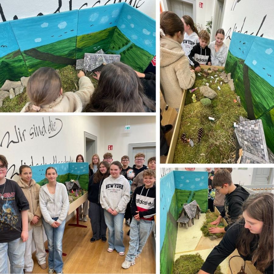 Seit einigen Schuljahren wird in der Wirtschaftsschule in der Weihnachtszeit traditionell eine Landschaftskrippe aufgebaut. In diesem Jahr übernahm die Aufgabe die Klasse 7a. Mit handgefertigten Figuren und Tieren gestaltete sie die diesjährige Schulkrippe. Beim Aufstellen wurde auch die jeweilige Geschichte der entsprechenden Figur thematisiert. Jetzt freut sich die Klasse auf den Start der Adventszeit.
